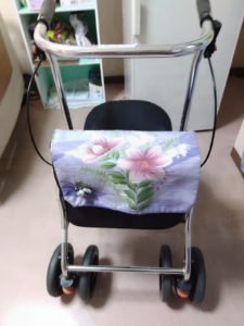 そこで、福祉用具さんに相談、了解を得て、○○様の好きな薄紫色でバックの部分を細工、世界にひとつだけの歩行器になりました。とても喜んで頂きその後はほとんど休みなくデイサービス利用されていました。